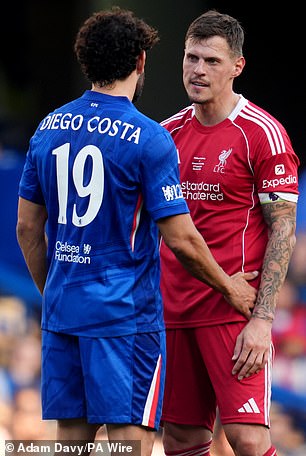 But Costa saw himself embroiled in a spectacular bust up with old enemy Martin Skrtel, leading to a yellow card in remarkable scenes given the game was classed as a ‘friendly’ for charity.