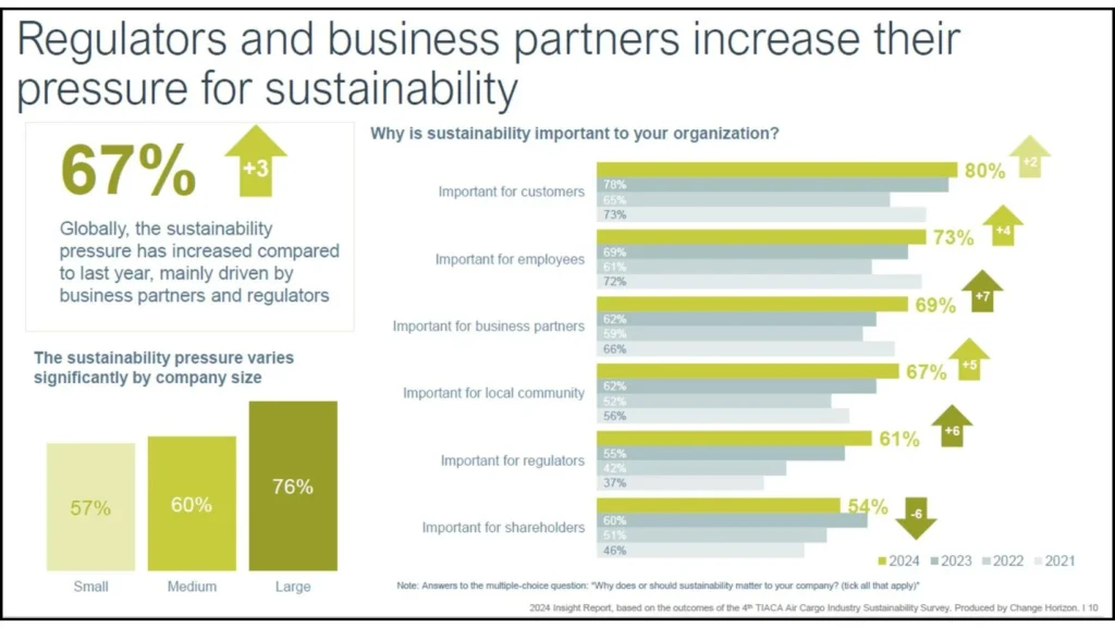 Sustainability considerations are becoming increasingly critical for air cargo and, consequentially, e-commerce logistics. The TIACA annual Sustainability survey illustrates that sustainability considerations are important for many industry stakeholders, as illustrated in the chart below.