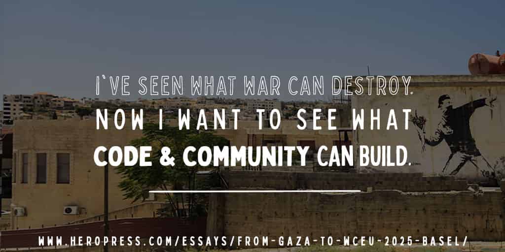That pain never fades, a constant shadow following me even as I kept going for all of them. While I walked freely through Switzerland, my parents, sisters, and closest friends remained trapped in Gaza’s nightmare, existing without homes, surviving on animal feed disguised as bread, drinking contaminated water that makes them sick, living without electricity, schools, or hospitals. They endure each day without the most basic human right: safety. The genocide continues relentlessly, now over a year and a half of systematic destruction. Every morning, with trembling hands, I check my phone not for work messages but for the simplest, most desperate confirmation—that my family is still breathing, still alive. So as I sat listening to talks about WordPress performance and block themes, my heart remained split in two, my body in Basel, but my soul still in Gaza, aching with every breath for those I left behind