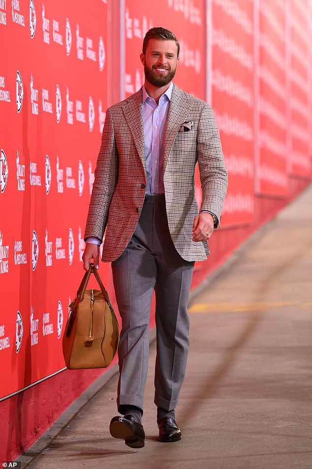‘Maybe it’s time for Harrison Butker to learn to cook and get his a** in the kitchen where he belongs,’ one critic wrote on X. ‘He clearly does not belong in the NFL.’