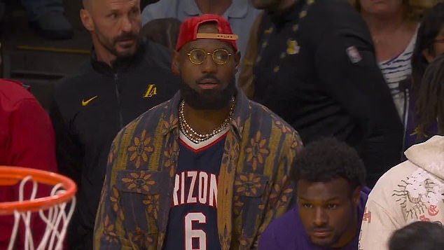 James was pictured courtside in Los Angeles, as he cheered on his teammates during the game, with fans quick to note the unique outfit that he had on.