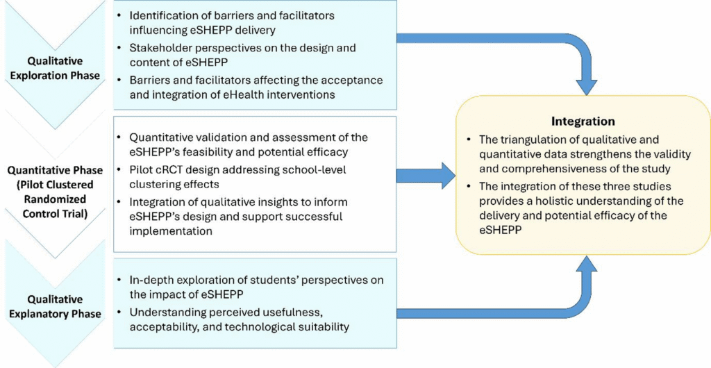 Study design A sequential mixed methods design has been selected for this study as it combines qualitative and quantitative approaches to provide a comprehensive understanding of the eSHEPP digital application. The design begins with qualitative exploration, followed by pilot cluster randomized controlled trial (cRCT) (quantitative validation), and concludes with a qualitative explanation phase. This progression […]