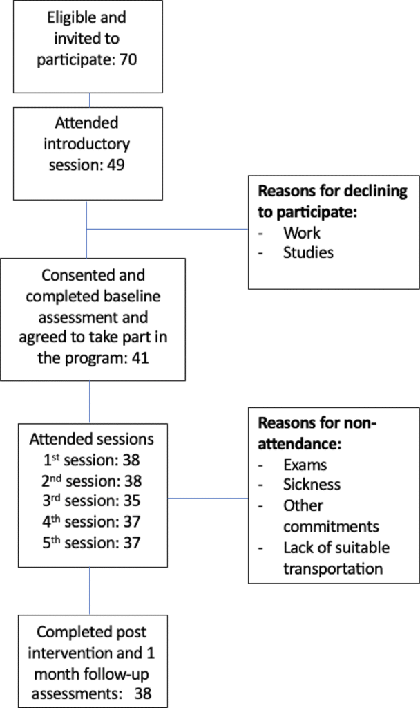 The intervention lasted five weeks, and participants were followed up one month after completion (See Fig. 1). The intervention aimed to help participants use readily available resources and adopt healthy lifestyle changes in their daily routines. It involved two-hour face-to-face sessions each week and daily virtual support. The virtual support included an online chat group using WhatsApp. Additionally, one of the weekly meetings was held virtually (via Zoom) based on the participants’ preference, as it coincided with school holidays. Attendance at the virtual session was comparable to face-to-face sessions (see Fig. 1).