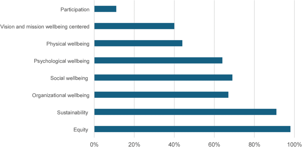 A noteworthy observation is that references to equity and sustainability are often absent from initiatives aimed at promoting psychological, physical, social, and organizational wellbeing. This indicates a compartmentalized approach, where these principles are treated as separate domains rather than foundational elements embedded across all aspects of university life.