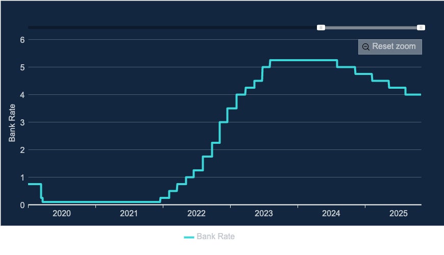 This chart helps display the rate of change, at least: post-Covid we had basically a zero rate for a long period, but the cost of living crisis across 2022 and 2023 saw interest rates shoot higher in quick succession as the BoE tried to stem inflation, which hit 11%.