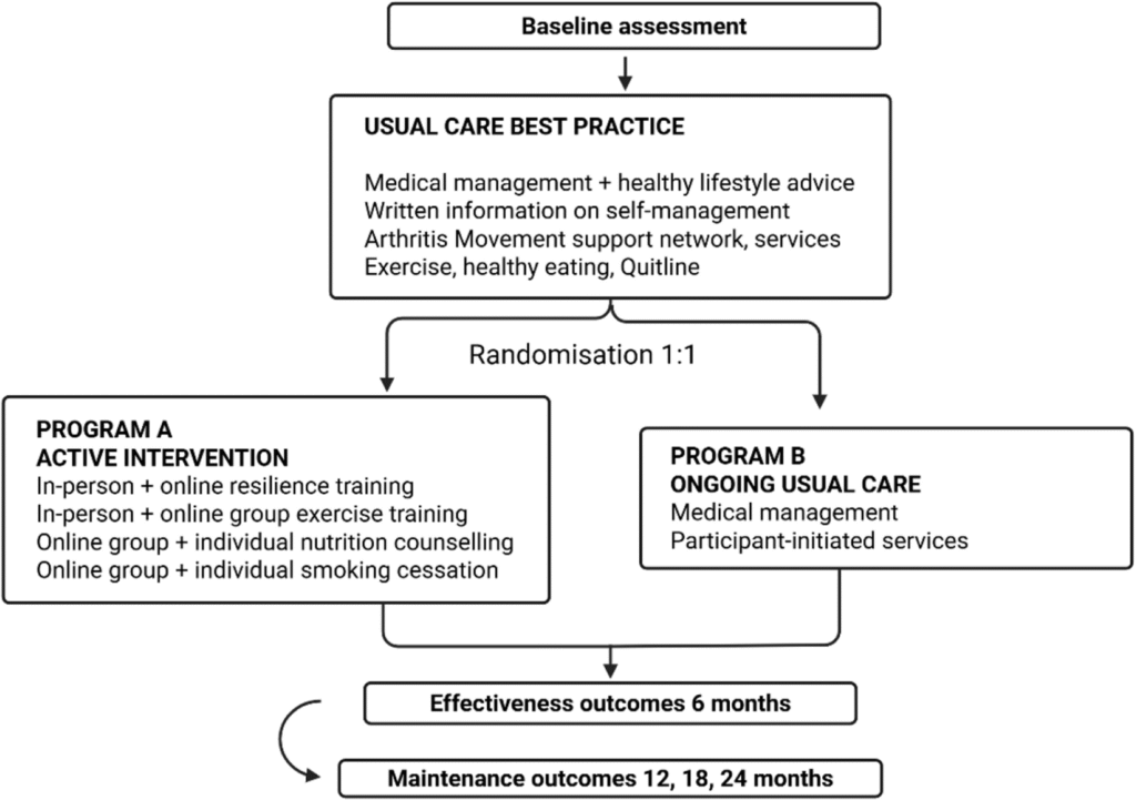 Reach refers to eligible people willing to engage with programmes. It will be measured firstly as the number of people who consent to the trial as a function of the number of queries from eligible potential participants. Participant representativeness will compare sociodemographic, lifestyle and clinical profile of the trial participants with the A3BC database of RA participants with RA onset in the last 12 months. Reach in each arm will be assessed as the proportion of participants recruited to the study who (i) in programme A engage with each component (resilience, exercise training, nutrition, smoking cessation, and behaviour change) and (ii) in programme B seek engagement with professional services related to mental health, exercise, nutrition or smoking cessation support for RA, including through The Arthritis Movement programmes or private service providers.