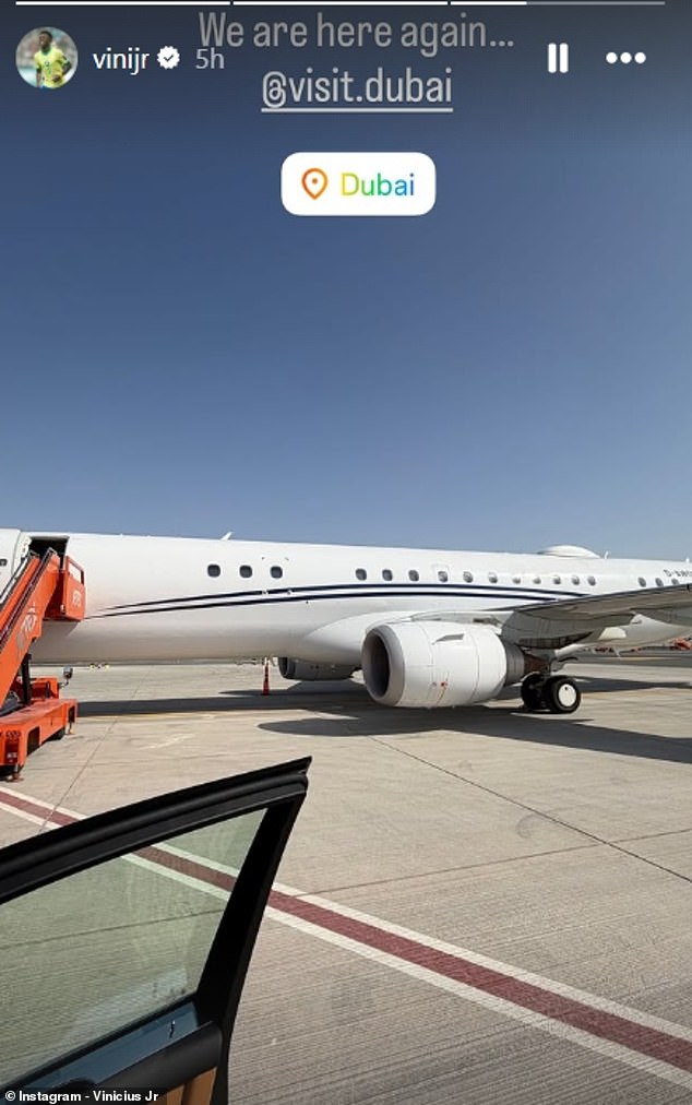 Posting a snap of what appeared to be a private jet in the Dubai sunshine, Vinicius added: ‘We are here again… @visit.dubai.’