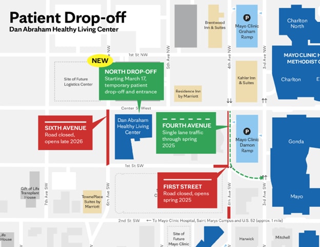 On Monday, March 17, construction near the Dan Abraham Healthy Living Center will narrow 1st St SW between 4th and 6th Ave SW, removing on-street parking and closing the drop-off area on the south side. While the entrance on the south side of the building will remain open to pedestrians, vehicles dropping off patients and […]